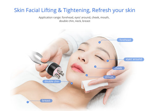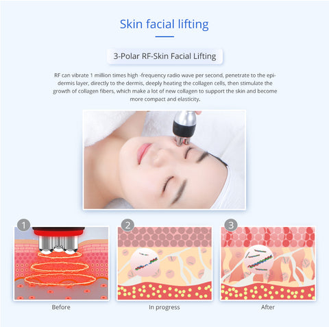 It can be used for facial and body cosmetic A radio frequency emitter is pressed up against the skin. These radio waves get past the outer skin layers and deliver heat energy to the muscles and tissues beneath. The heat helps to contract these layers and build up collagen levels. The overall result tightens up the outer layers of skin and reduces wrinkling effects. Since there's a lot of heat involved, some cooling must be applied to the skin at the same time.