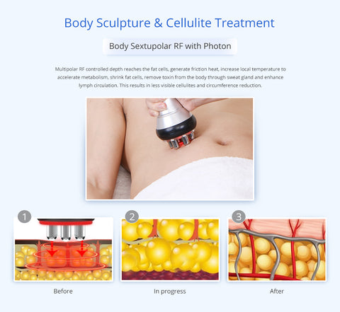 The instrument integrates state-of-the-art Radio Frequency technology and Radio Frequency to reach deep fat bodies with superior performance for targeted Radio Frequency. In a fast-active state, fat cell tissue can generate frictional heat, increase local temperature, remove excess fat and toxins from the body through the sweat glands, intestinal circulation, and lymph, and finally achieve the effect of dissolving fat.