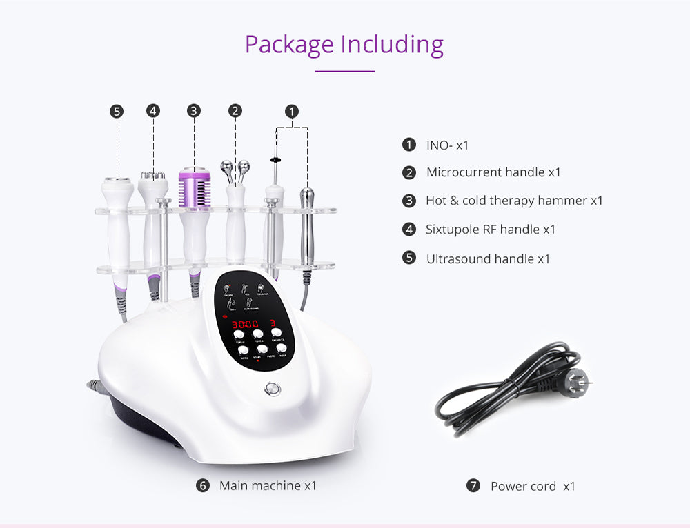 The cool thing about this one is that it brings together features that solve most skin problems. It contains a +Hot&Cold therapy hammer+ + -ION Skin-lift +Sixtupole Radio Frequency handle +High Microcurrent handle +Ultrasound handle.