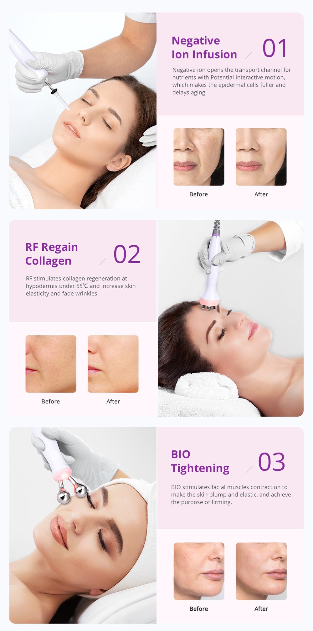 Through the output of the simulated human body's own biological current, through the skin into muscle cells, stimulate the energy contained in the cell ATP, so that the cell returns to normal operation and function. This equipment is the application of the latest technology, the present computer program, facial lines, grinding, double chin, wrinkles, crow's feet, bags, black circles, and other better shape, promote facial blood circulation and transfer, reduce facial splash and pore contraction. Biological firming, refining facial skin in the state of blood, play a role in anti-loose skin, to achieve the purpose of beauty.